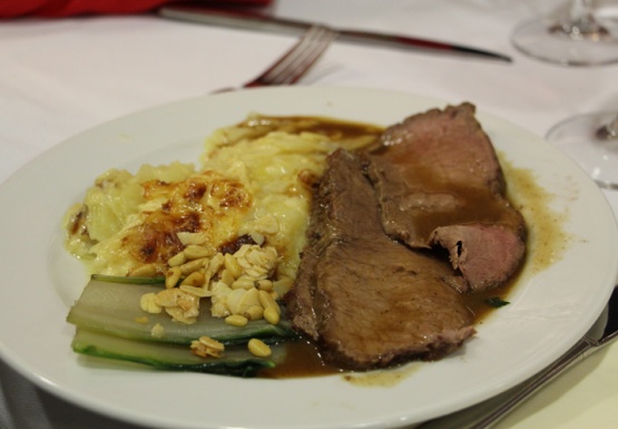 Nach einer kurzen Pause wurde das Essen serviert. Es gab wahlweise ein Roastbeef mit Kartoffelgratin, Mangold und Mandeln oder Fettucine mit Garnelen, geschmorten Tomaten, Pinienkernen und Ruccolasalat.