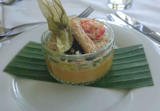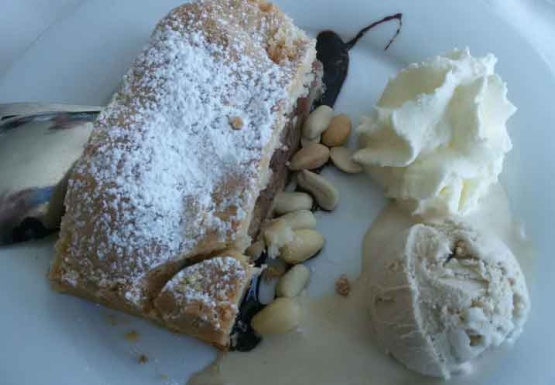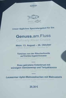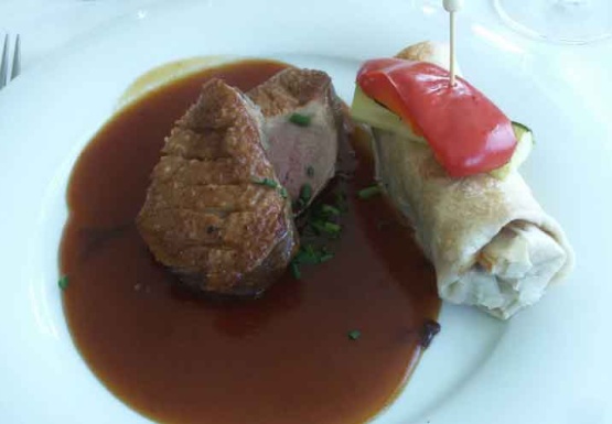 Auf der Fahrt von Melk nach Krems wurden die Gäste mit einem 3-gängigen Menü und frei zu wählenden Getränken des Caterers - Fa. Patzalt - verwöhnt. Als Vorspeise gab es Törtchen von der Räucherforelle auf Kürbis mit Ingwermousse, als Hauptspeise eine rosa gebratene Entenbrust mit Gemüsewrap und Teriyakisauce. Zum Abschluß genossen wir Apfel-Walnusskuchen mit Walnusseis.