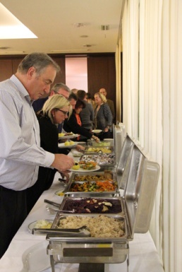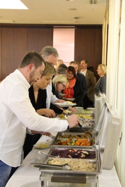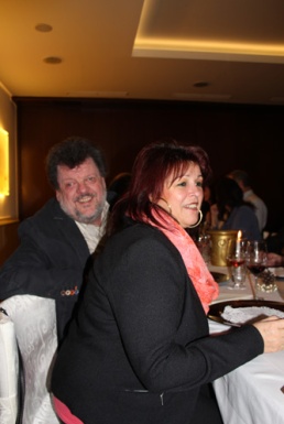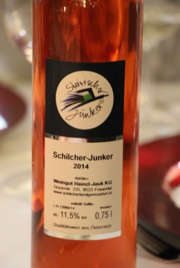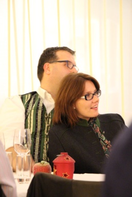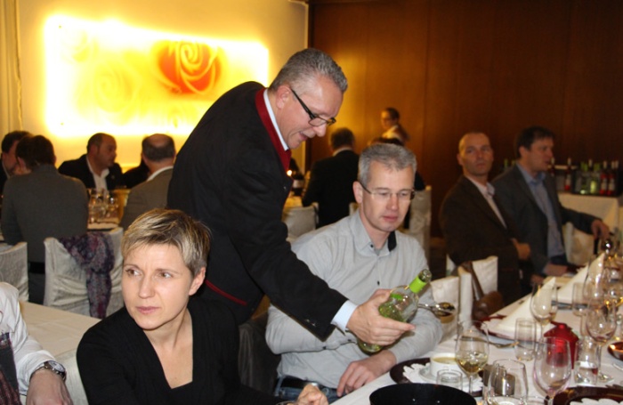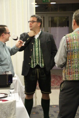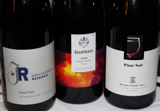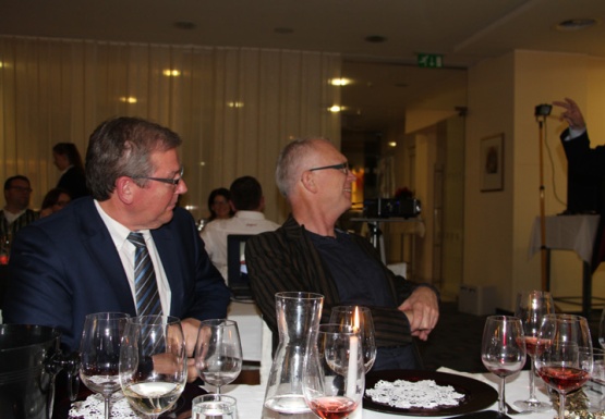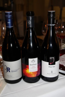 Die ersten beiden Weine wurden von Vinothekarin Regina Bernhard und Weinakademiker Wolfgang Kienbacher kommentiert verkostet, die restlichen Weine konnten nach Lust und Laune frei degustiert werden . Der erste Jungwein „Pannonikus“ stammte vom Winzer Allacher aus Gols im Burgenland (haupts. Grüner Veltliner). Der zweite Wein war der „Primo“ vom Weingut Degn aus Hohenruppersdorf im Weinviertel (Cuvee aus Müller Thurgau, Grüner Veltliner und gelber Muskateller). Er trank sich frisch-fruchtig und duftete etwas nach Eiszuckerl und Pfirsich. Als dritter Wein wurde ein Schilcher vom Weingut Hainzl-Jauk aus der Weststeiermark eingeschenkt und die Vorspeise – eine köstliche Ganslsuppe - dazu serviert. Zur Hauptspeise – einem Weihnachstgansl mit tollem Beilagenbuffet – durfte man aus 3 Pinot Noirs wählen. Diese waren ein Jg. 2012 vom Weingut Auer aus der Thermenregion (Tattendorf), ein Jg. 2011 vom Weingut Johanneshof Reinisch (ebenfalls Tattendorf) und der Pinot Noir „Siglos“ (Jg. 2010) vom Weingut Gesellmann aus Deutschkreuz im Mittelburgenland. Die Weine dufteten alle nach roten Beeren (Erdbeere, Himbeere), Unterholz und Pilzen - typisch für Pinot Noir. Weinakademiker Wolfgang Kienbacher wies darauf hin, daß man Pinot Noir niemals dekantieren sollte und dass jeder Pinot Noir durch seine Flaschenform sofort verraten wird.