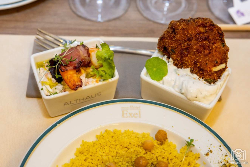 Nun wurde das Kaltspeisenbuffet eröffnet. Es gab Kaspressknödel mit Tzatziki, Cous Cous mit Kichererbsen-Curry, Speckgarnelen im Gemüserahm.